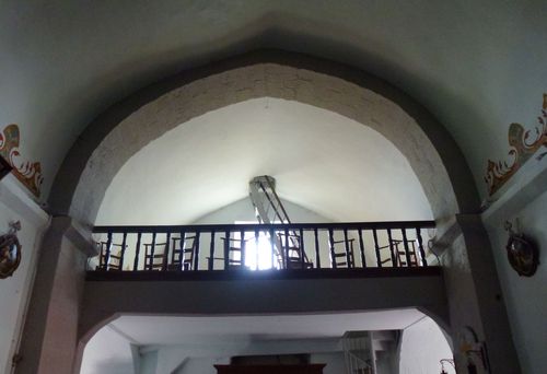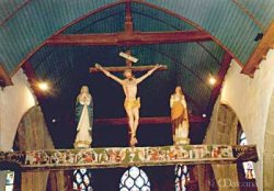 Peut-être installe-t-on aussi entre la nef et le chur, sur toute la largeur, fixée sur les larges tailloirs de l'arc triomphal, une "poutre de gloire" peinte et sculptée, supportant un grand crucifix, pour l'édification des fidèles (ci-contre, la poutre de gloire d'une église bretonne).